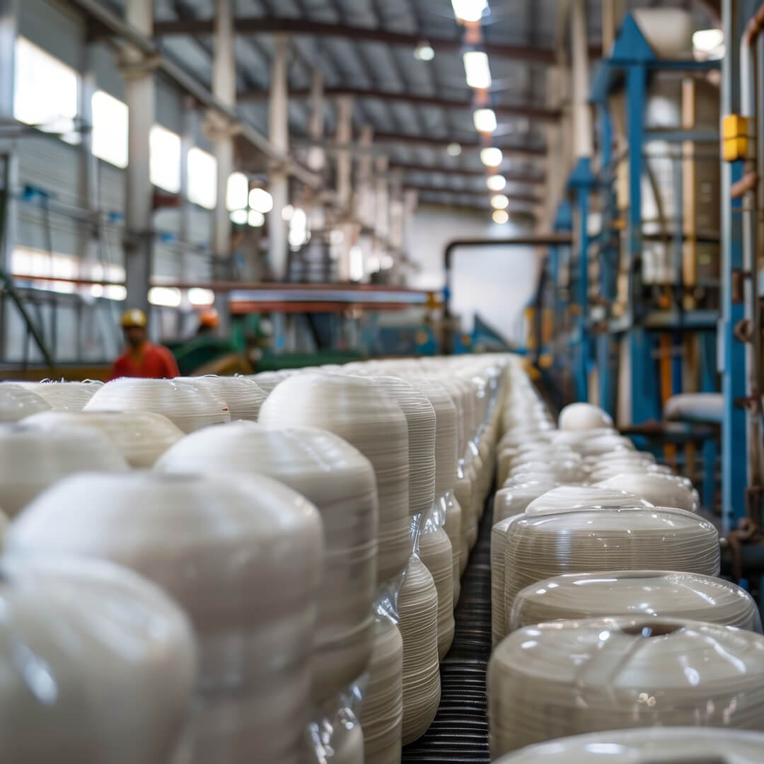 The pellets are extruded and spun into a yarn.